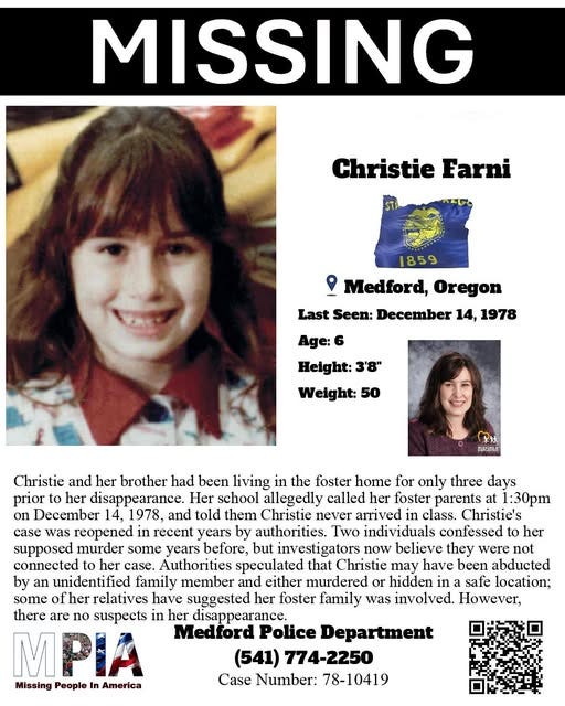 On the morning of Dec. 14, 1978, 6-year-old Christie Lynn Farni walked out of her foster home and vanished. What began as a routine school day quickly spiraled into one of Jackson County’s most haunting mysteries. Nearly five decades later, the case remains the region's oldest unsolved disappearance.